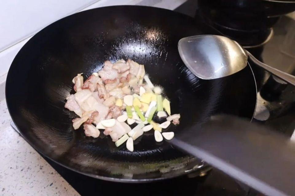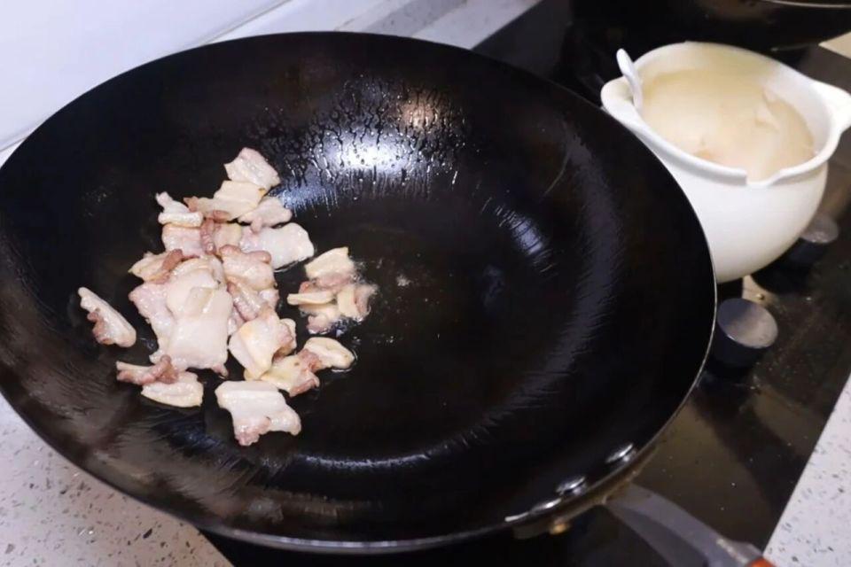 4、下入五花肉,把五花肉的油脂给煸炒出来,看到五花肉肥肉部分有点微微变黄就不错了,这个时间锅里的油还会有好多,不要滥用盛出来留着炒菜用。