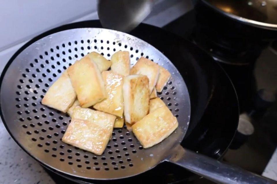 3、锅中烧油,提议用菜籽油,煎出来豆腐滋味更好,下豆腐之赶赴锅里撒上一丝点盐,一是防患豆腐粘锅,二是能给豆腐入个底味。豆腐全部放入锅中后不要紧张翻面,震憾锅子煎至豆腐定型,一面煎的金黄了翻面,两面煎好后控一下油捞出。